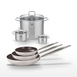 - PETIT + : PETIT + : Les poêles sont dotées d'un revêtement antiadhésif ELODUR® Select pour une cuisson sans matière grasse. Les faitouts préservent les vitamines grâce à leur fond capsulé.