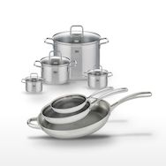 - COMPOSITION : Acier inoxydable 18/10 pour les poêles et acier inoxydable avec couvercle en verre pour les faitouts, assurant durabilité et performance.