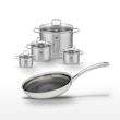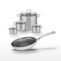 - COMPOSITION : COMPOSITION : Acier inoxydable 18/10 et verre pour les faitouts, structure Triply pour la poêle avec revêtement antiadhésif sans PFAS.