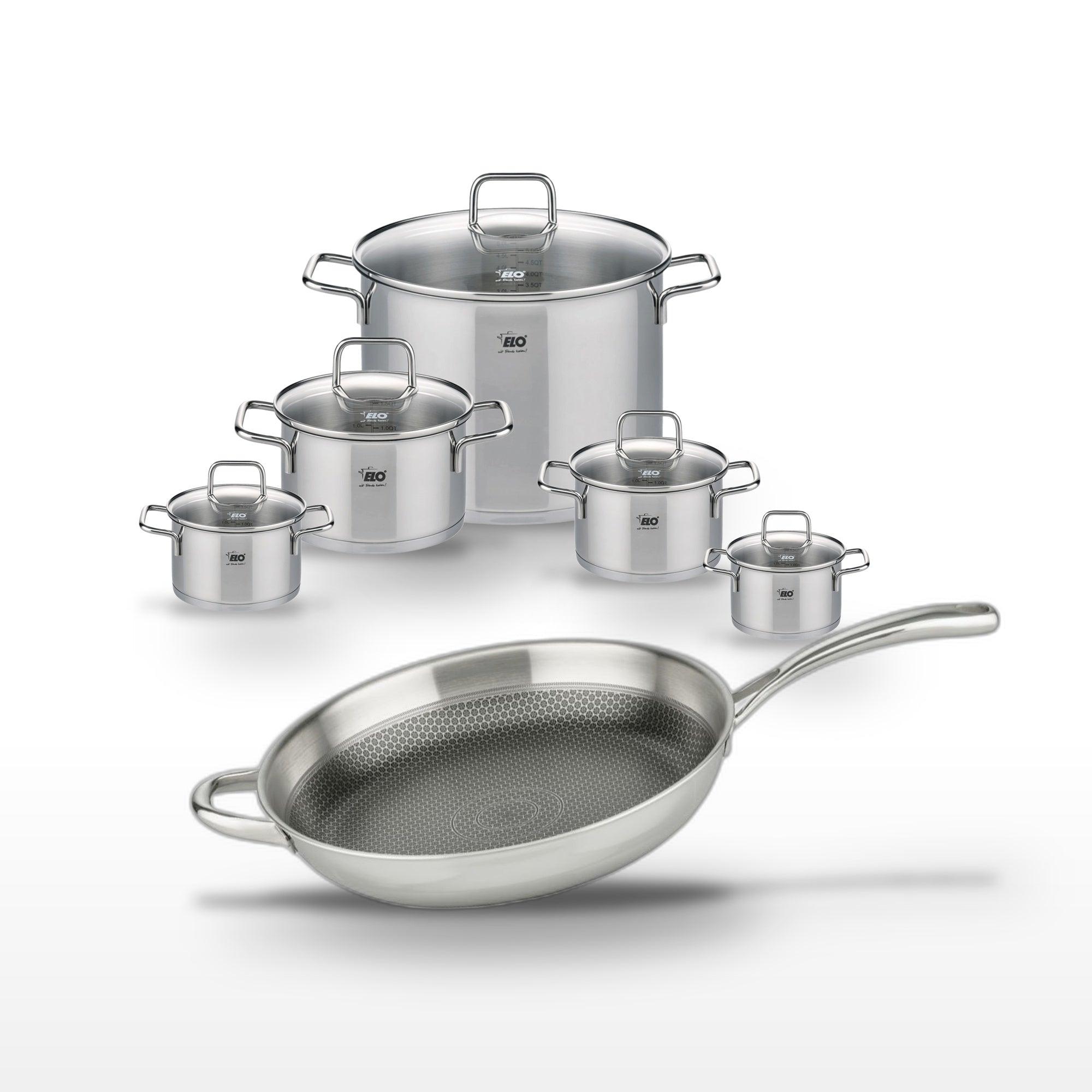 - COMPOSITION : Acier inoxydable de haute qualité, revêtement antiadhésif ELODUR® Professional pour la poêle, couvercles en verre.