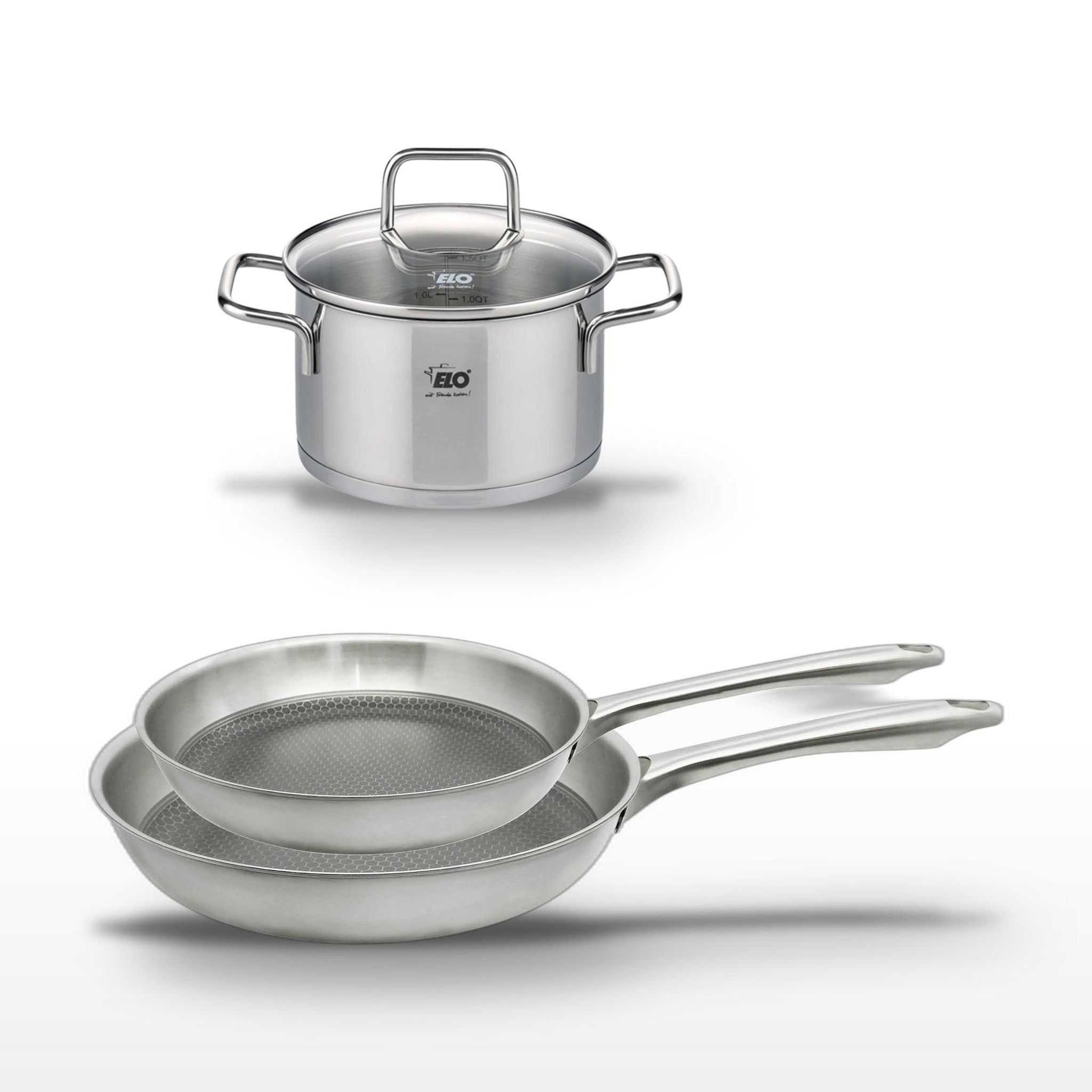 - DESCRIPTION : DESCRIPTION : Ce lot Elo vous offre deux poêles en inox de 24 et 28 cm et un faitout de 16 cm. Profitez d'une cuisson homogène grâce à leur conception avancée.