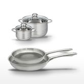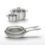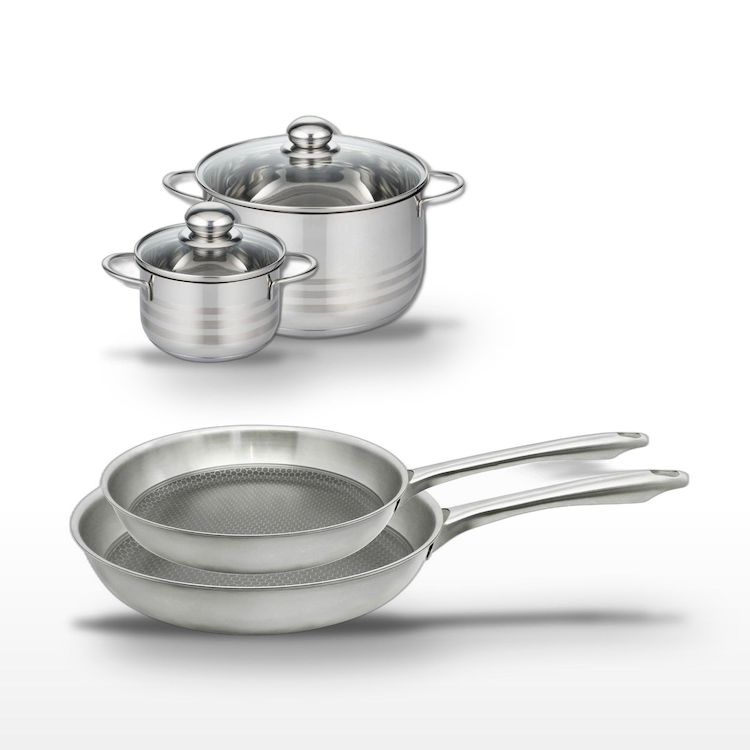 - COMPOSITION : Fabriqués en acier inoxydable de haute qualité, ces ustensiles allient robustesse et élégance. Le revêtement antiadhésif des poêles est sans PFAS, garantissant une utilisation sûre.