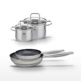 - COMPOSITION : COMPOSITION : Poêles en acier inoxydable avec revêtement sans PFAS, faitouts en inox avec couvercles en verre.