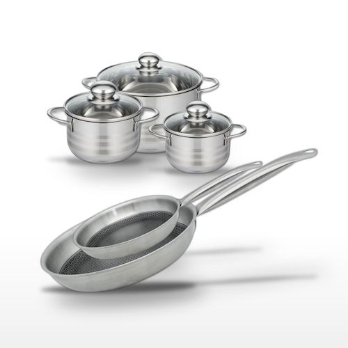 - DESCRIPTION : DESCRIPTION : L'ensemble Elo Relief Solution inclut deux poêles et trois faitouts en acier inoxydable, idéaux pour une cuisine saine et efficace.