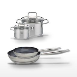 - DESCRIPTION : DESCRIPTION : Profitez de deux poêles en céramique sans PFAS de 24 et 28 cm et de deux faitouts en inox avec couvercles. Idéal pour une cuisson saine et homogène.