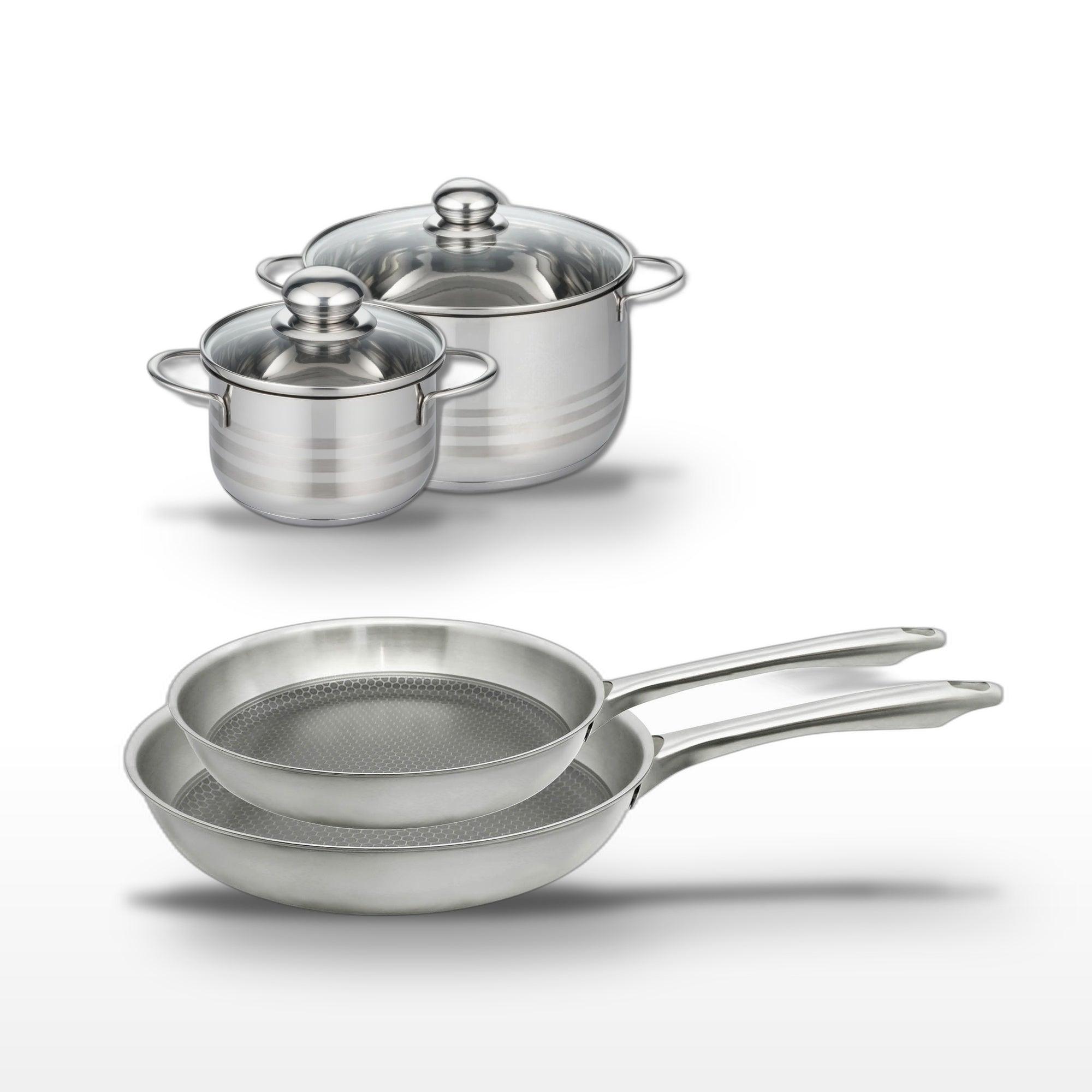 - COMPOSITION : Poêles en acier inoxydable avec revêtement sans PFAS et faitouts en inox avec base économie d'énergie, garantissant une chaleur uniforme.