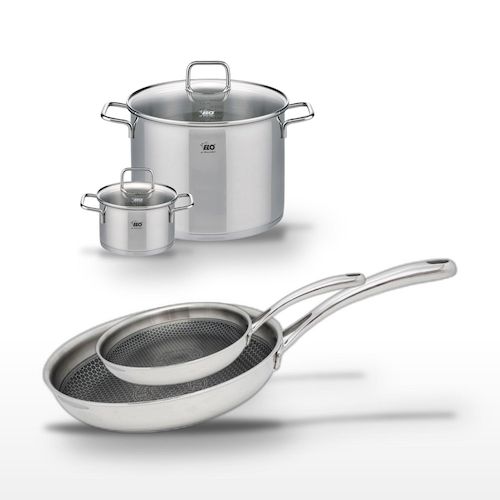 - DESCRIPTION : DESCRIPTION : L'ensemble Elo Relief Evolution inclut deux poêles en inox de 24 cm et 28 cm, et deux faitouts de 16 cm et 26 cm, idéaux pour une cuisson saine et efficace.