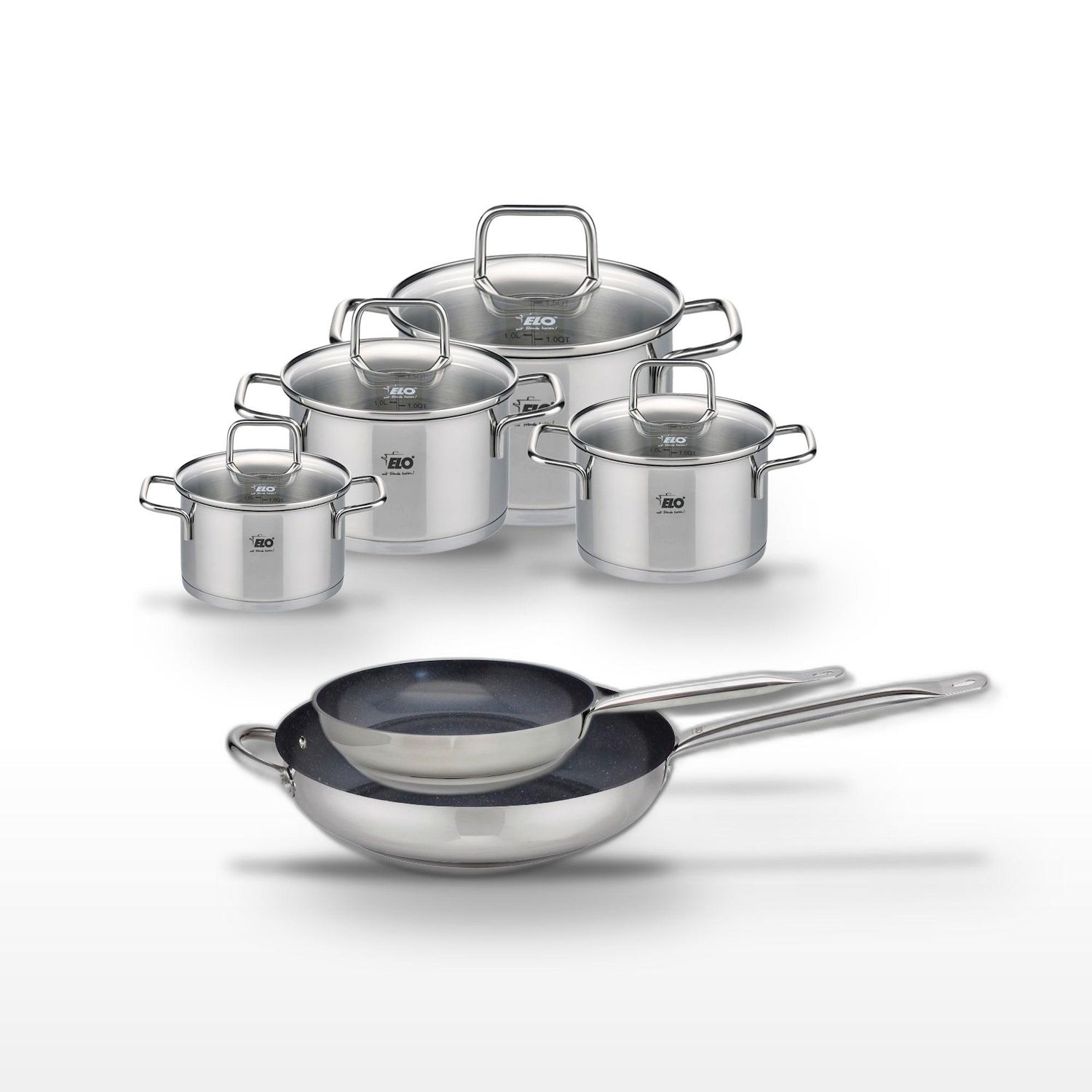 - COMPOSITION : Poêles en acier inoxydable 18/10 avec revêtement ELODUR®, faitouts en acier inoxydable et verre, garantis sans PFAS.