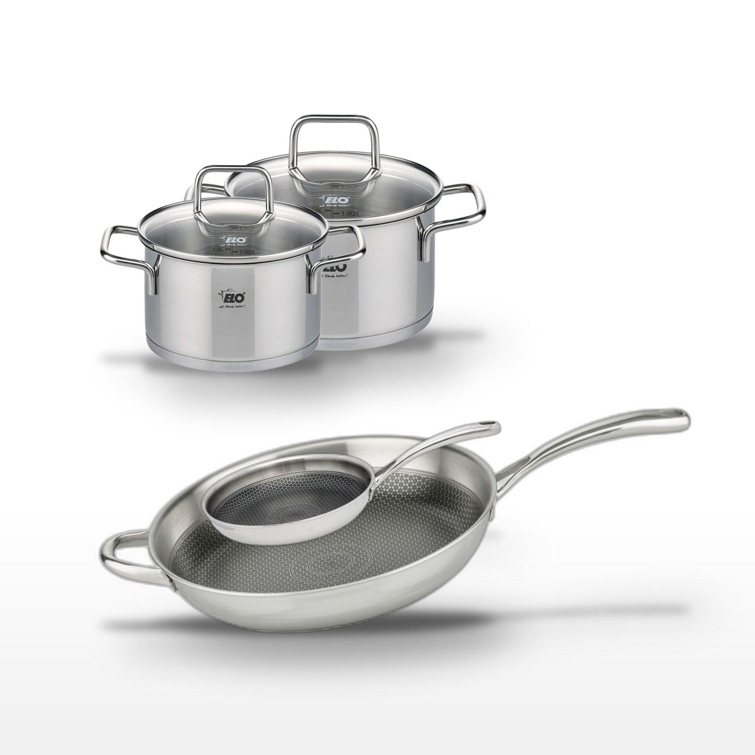 - DESCRIPTION : L'ensemble Elo Relief Evolution offre deux poêles et deux faitouts en inox, parfaits pour une cuisson homogène et saine grâce à leur revêtement antiadhésif et leur fond capsulé.