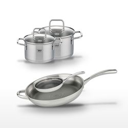 L'ensemble de cuisine Elo Relief Evolution est idéal pour les professionnels et les amateurs de cuisine exigeants. Composé de deux poêles en inox 18/10 de 24 cm et 32 cm, et de deux faitouts de 14 cm et 16 cm, cet ensemble assure une cuisson optimale grâce à sa technologie avancée. Les poêles sont dotées d'un revêtement antiadhésif ELODUR® Professional, exempt de PFAS, permettant une cuisson saine et sans attachement. Les faitouts, avec leur fond capsulé, garantissent une répartition uniforme de la chaleur et préservent les nutriments de vos aliments. Chaque pièce est compatible avec tous les types de feux, y compris l'induction, et est conçue pour un entretien facile. Cet ensemble est parfait pour les cuisines professionnelles et domestiques, offrant durabilité et performance exceptionnelle.