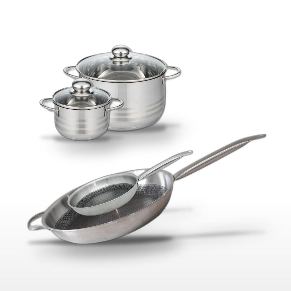 - DESCRIPTION : DESCRIPTION : Ensemble de poêles et faitouts Elo Relief Solution, en acier inoxydable 18/10, avec revêtement antiadhésif sans PFAS, pour une cuisson sans accrocs.