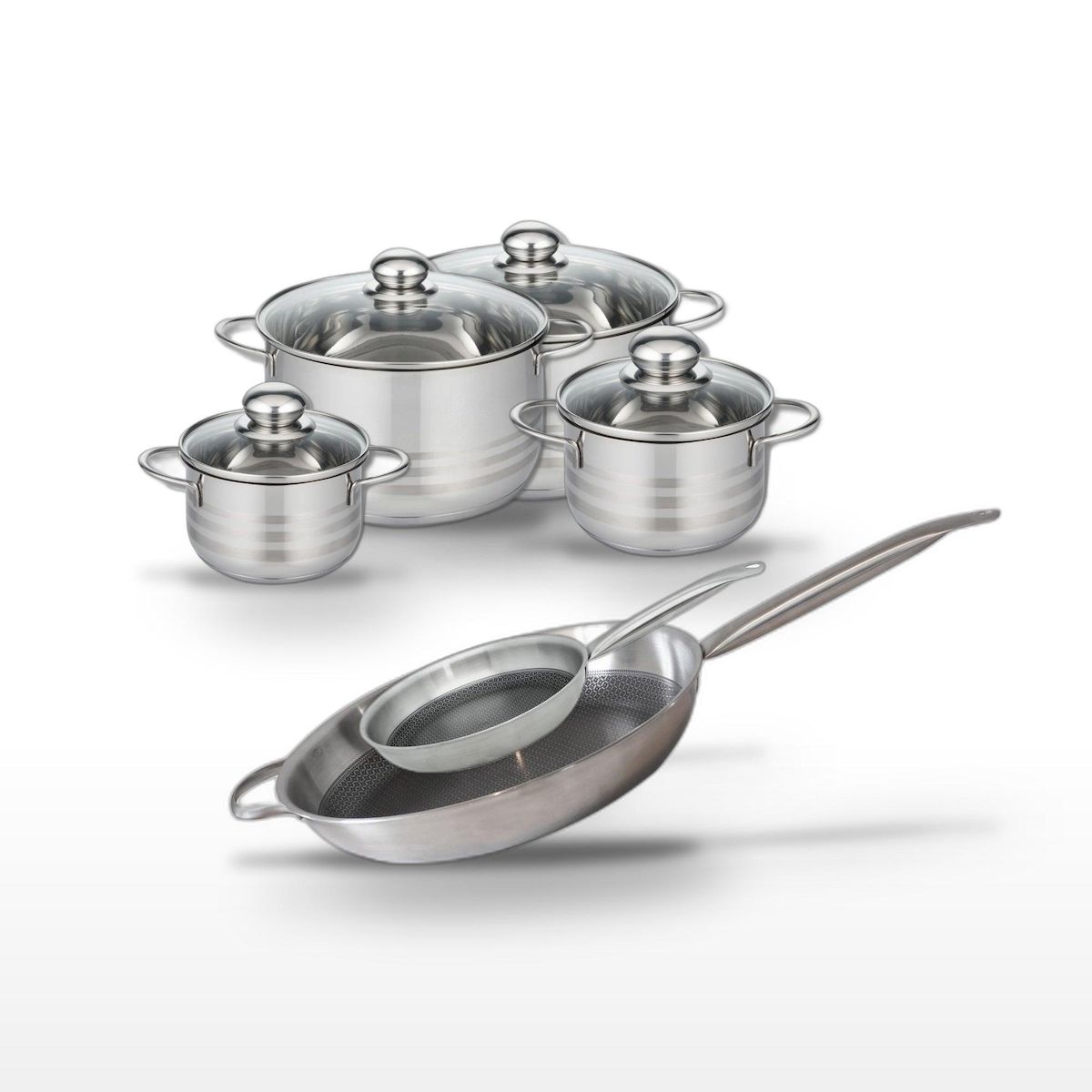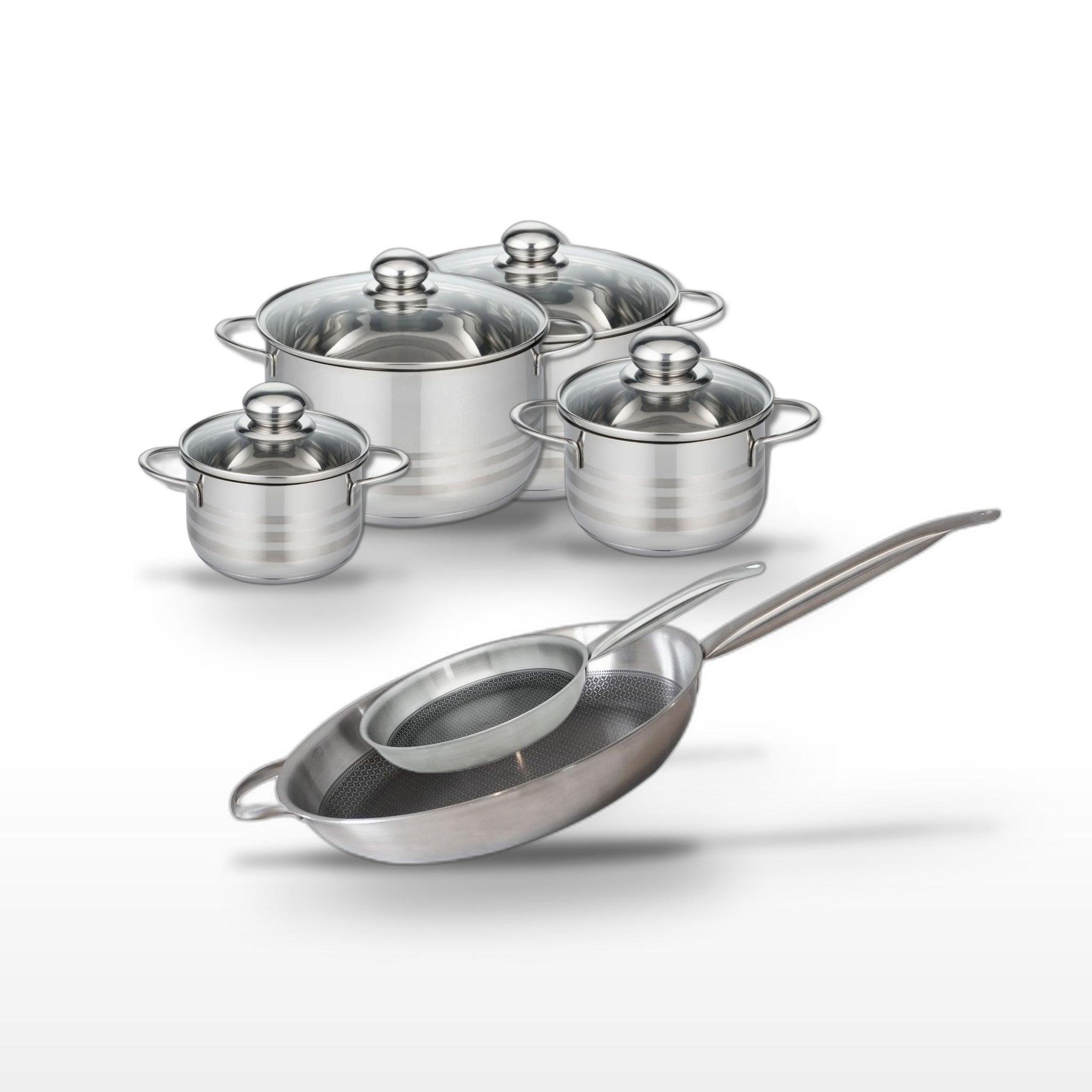 - DESCRIPTION : DESCRIPTION : Ensemble Elo Relief Solution avec 2 poêles et 4 faitouts en acier inoxydable, pour une cuisson homogène et sans effort.