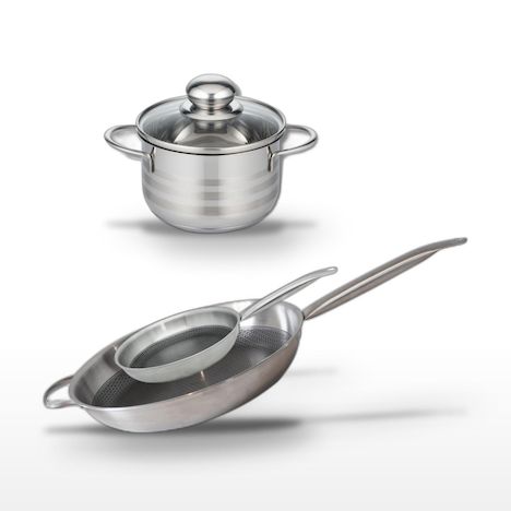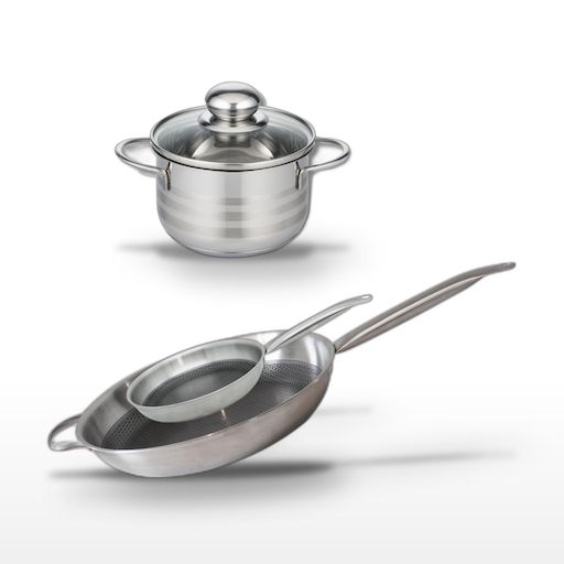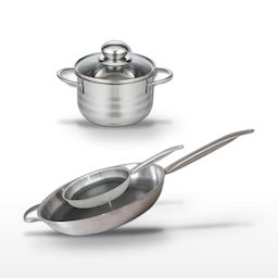 - DESCRIPTION : DESCRIPTION : Lot de deux poêles Elo Relief Solution et un faitout, offrant une cuisson homogène et une grande résistance grâce à l'acier inoxydable 18/10.