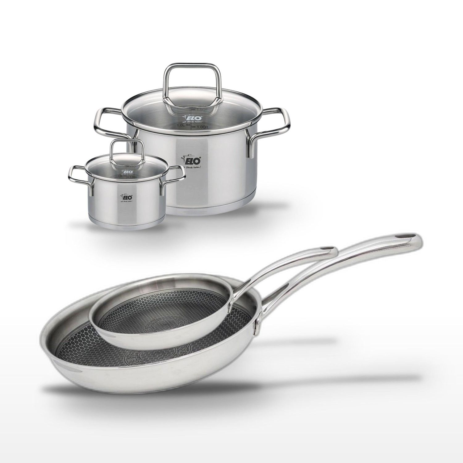 Lot de 2 Poêles 24 et 28 cm Elo Relief Evolution et 2 Faitouts 12 et 20 cm