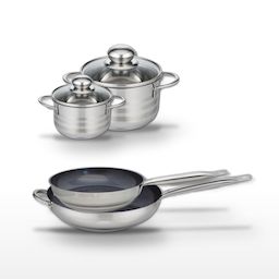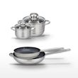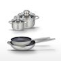 - COMPOSITION : Poêles en acier inoxydable 18/10 avec revêtement sans PFAS, faitouts en inox de haute qualité avec couvercles en verre.