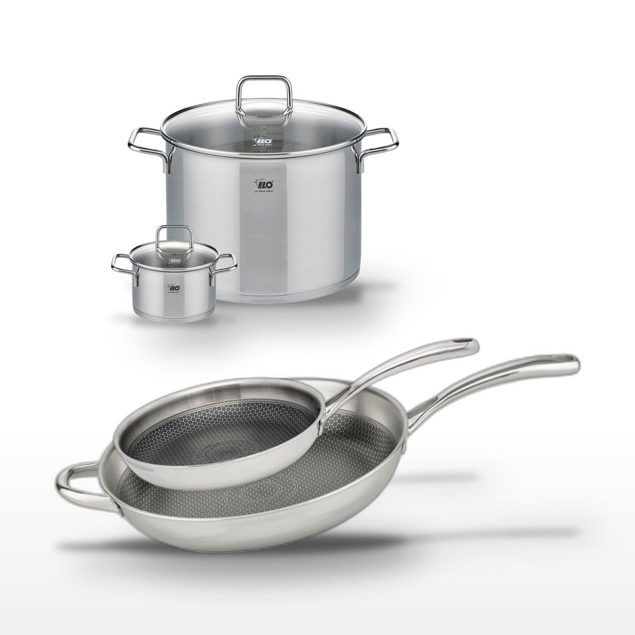 Lot de 2 Poêles 28/32cm en inox Elo Relief Evolution et 2 Faitouts 14/26cm