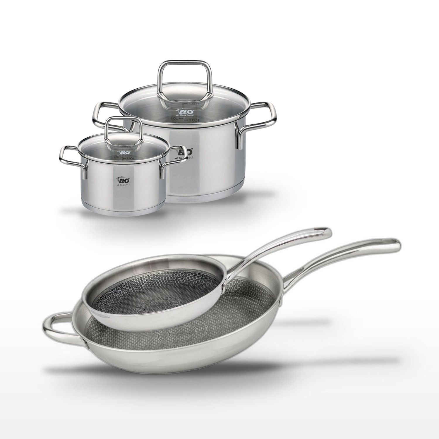 - DESCRIPTION : Ensemble Elo Relief Evolution avec poêles et faitouts en inox pour une cuisson homogène et saine.