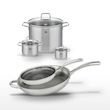 - COMPOSITION : Acier inoxydable 18/10 avec revêtement antiadhésif, noyau en aluminium, verre pour les couvercles.