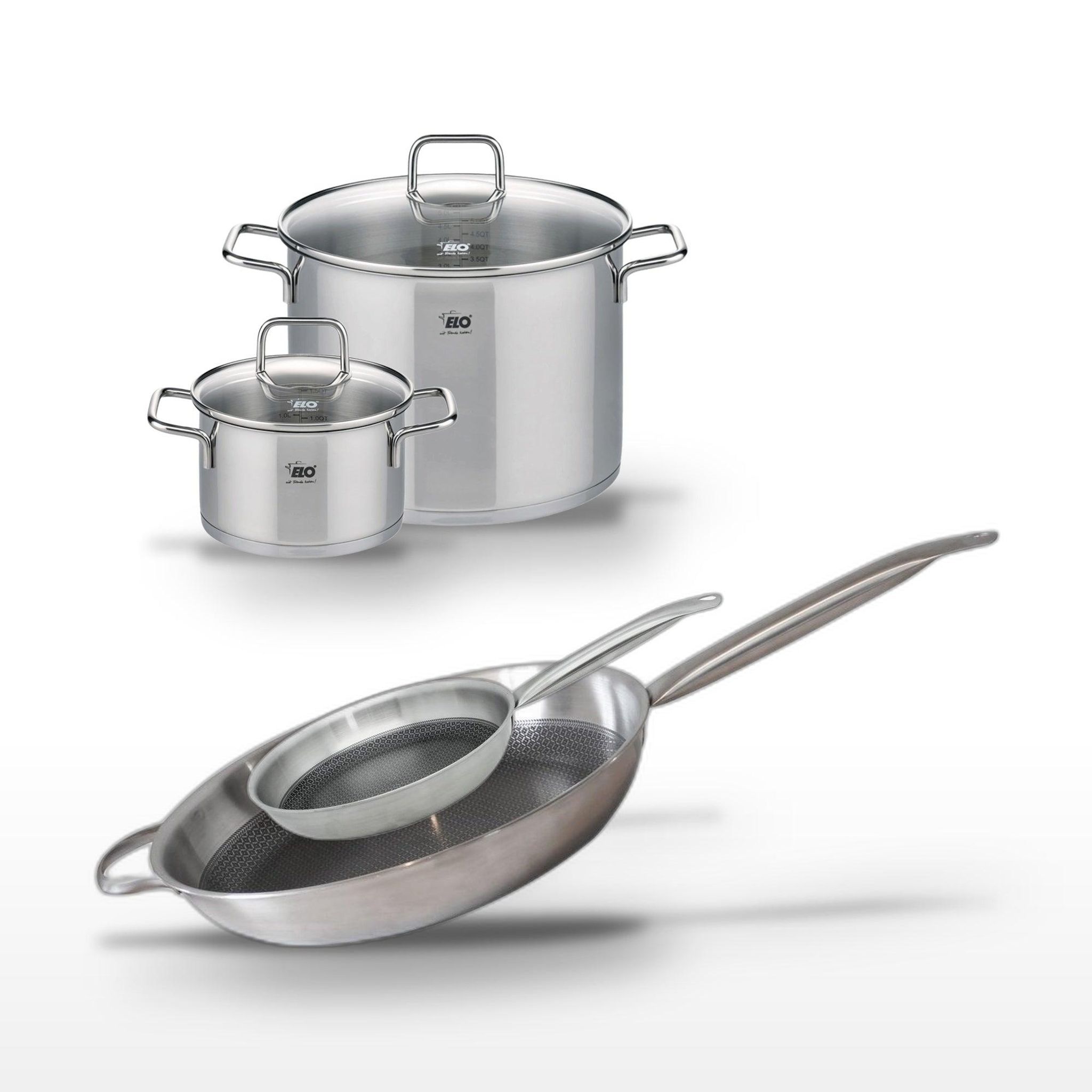 L'ensemble Elo Relief Solution est conçu pour répondre aux exigences des professionnels et des amateurs de cuisine. Composé de deux poêles en acier inoxydable de 32 cm et 24 cm, et de deux faitouts de 26 cm et 20 cm, cet ensemble garantit une cuisson homogène et économe en énergie. Les poêles, dotées d'un revêtement antiadhésif ELODUR® Select sans PFAS, permettent de cuisiner avec peu de matières grasses, tout en assurant une résistance aux rayures. Les faitouts, équipés d'un fond capsulé, préservent les vitamines, offrant ainsi des plats sains et savoureux. Conçus pour être compatibles avec tous les types de feux, y compris l'induction, et aptes à passer au four jusqu'à 240°C, ces ustensiles allient robustesse et élégance. Leur design moderne intègre des bords verseurs et des manches creux pour un confort d'utilisation optimal. Faciles à entretenir, ils passent au lave-vaisselle, garantissant une longévité et une performance constantes. Avec Elo, chaque détail est pensé pour faire de la cuisine un véritable plaisir.