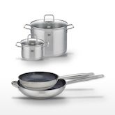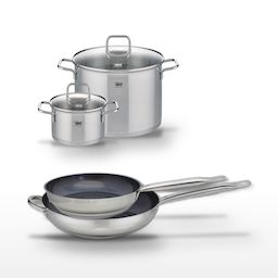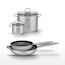 - COMPOSITION : COMPOSITION : Poêles en acier inoxydable 18/10 avec revêtement sans PFAS. Faitouts en acier inoxydable et verre pour une visibilité optimale pendant la cuisson.