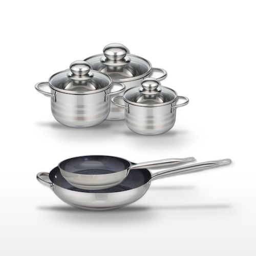- COMPOSITION : COMPOSITION : Poêles en acier inoxydable 18/10 avec revêtement sans PFAS, faitouts en inox avec couvercles en verre.