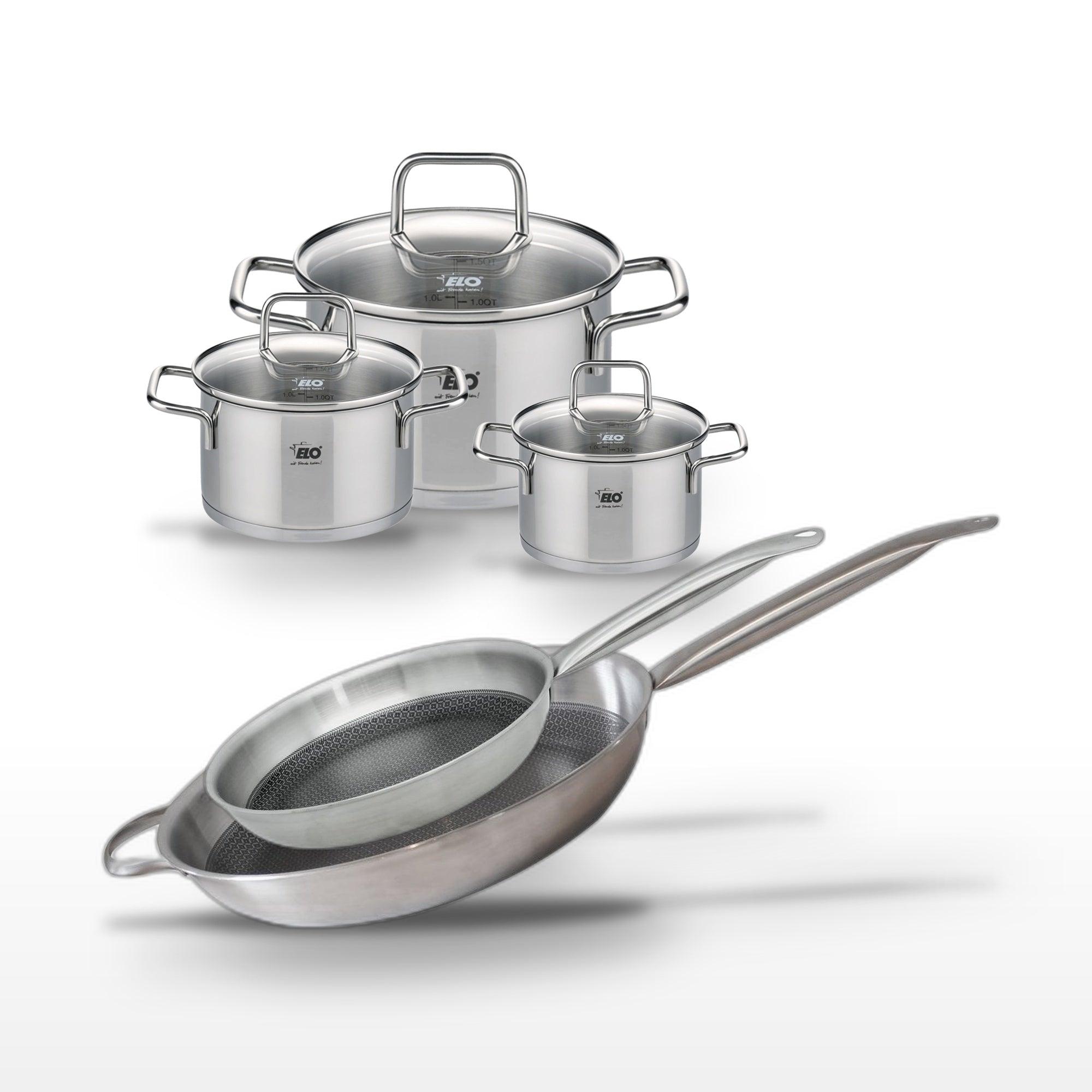 - DESCRIPTION : DESCRIPTION : Ce lot Elo comprend deux poêles en acier inoxydable 18/10 de la collection Relief Solution et trois faitouts de la collection Citrin, offrant une polyvalence exceptionnelle pour toutes vos préparations culinaires.