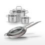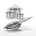 - COMPOSITION : COMPOSITION : Ensemble en acier inoxydable de haute qualité avec revêtement antiadhésif pour les poêles et fond capsulé pour les faitouts. Matériaux garantissant robustesse et performance.