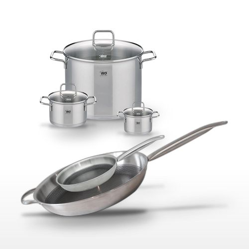 - DESCRIPTION : Ensemble Elo Relief Solution avec 3 faitouts et 2 poêles en acier inoxydable. Cuisson homogène et économique, revêtement antiadhésif.