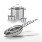 Ce lot de faitouts et poêles Elo est conçu pour répondre aux exigences des professionnels de la cuisine. Les faitouts en inox Elo Citrin sont parfaits pour préparer une variété de plats, de la cuisson de pâtes à la préparation de plats mijotés. Leur fond capsulé assure une distribution uniforme de la chaleur, économisant ainsi l'énergie tout en préservant les nutriments essentiels. Les poêles Elo Relief Solution se distinguent par leur revêtement antiadhésif ELODUR® Select, offrant une surface de cuisson résistante aux rayures et facile à nettoyer. La combinaison de l'acier inoxydable et de l'aluminium garantit une conductivité thermique optimale, essentielle pour des résultats de cuisson parfaits. Chaque élément de cet ensemble est compatible avec tous les types de feux, y compris l'induction, et peut être utilisé au four jusqu'à 240°C, offrant ainsi une grande flexibilité dans la préparation des repas. En choisissant Elo, vous optez pour une cuisine élégante et fonctionnelle, avec des ustensiles robustes et durables qui répondent aux besoins des chefs les plus exigeants.