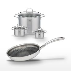 - COMPOSITION : COMPOSITION : Acier inoxydable de haute qualité, verre pour les couvercles des faitouts, revêtement ELODUR® pour la poêle.