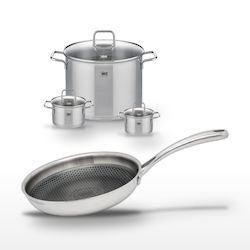 - COMPOSITION : COMPOSITION : Acier inoxydable de haute qualité, verre pour les couvercles des faitouts, revêtement sans PFAS pour la poêle.