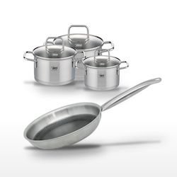 Ce lot professionnel Elo Relief Solution est conçu pour répondre aux exigences des cuisines modernes. Composé de trois faitouts (12 cm, 14 cm, et 16 cm) et d'une poêle de 24 cm, cet ensemble est fabriqué en acier inoxydable 18/10 de haute qualité. Les faitouts disposent d'un fond capsulé qui optimise la consommation d'énergie, idéal pour une cuisson efficace et respectueuse des nutriments. La poêle est dotée d'un revêtement antiadhésif ELODUR® Select, garantissant une cuisson sans adhérence et facile à nettoyer. Tous les éléments sont compatibles avec tous types de feux, y compris l'induction, et la poêle peut être utilisée au four jusqu'à 240°C, offrant une grande polyvalence. Ce lot est parfait pour les professionnels recherchant robustesse et performance.