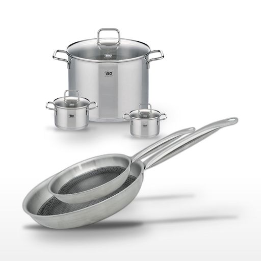 - DESCRIPTION : DESCRIPTION : Profitez du lot Elo Relief Solution, comprenant 3 faitouts et 2 poêles en acier inoxydable, pour une cuisine saine et performante.
