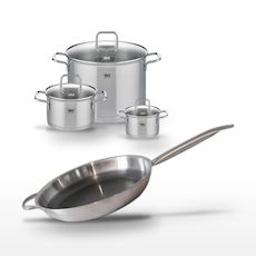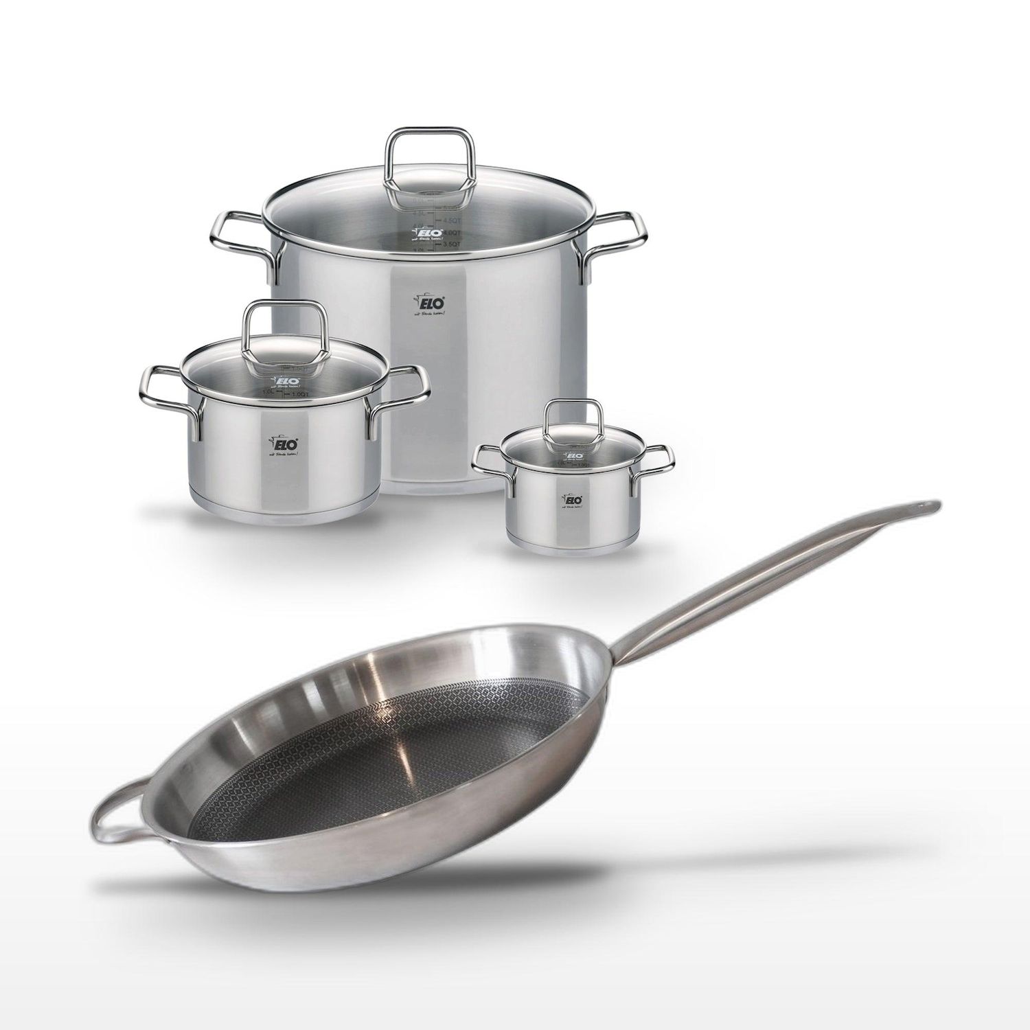 - DESCRIPTION : DESCRIPTION : L'ensemble Elo Relief Solution inclut trois faitouts et une poêle, tous en acier inoxydable, pour une cuisine efficace et savoureuse.