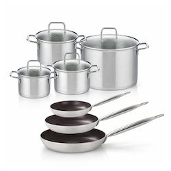 - COMPOSITION : COMPOSITION : Poêles en aluminium avec revêtement céramique sans PFAS, faitouts en acier inoxydable avec couvercles en verre.