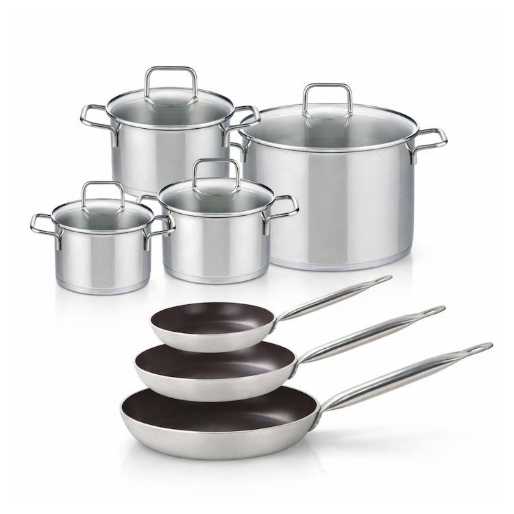 - COMPOSITION : COMPOSITION : Poêles en aluminium et inox avec revêtement céramique, faitouts en acier inoxydable avec couvercles en verre. Matériaux résistants à la chaleur et compatibles avec tous les feux.
