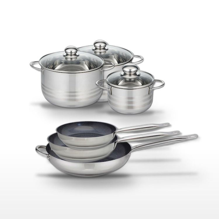 - COMPOSITION : COMPOSITION : Poêles en acier inoxydable 18/10 avec revêtement sans PFAS. Faitouts en inox de haute qualité avec couvercle en verre résistant.