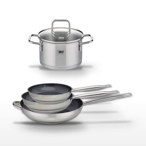 - DESCRIPTION : Ensemble Elo avec 3 poêles en inox de 24, 28 et 32 cm et un faitout de 20 cm, tous dotés d'un revêtement sans PFAS pour une cuisson saine et uniforme.
