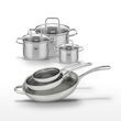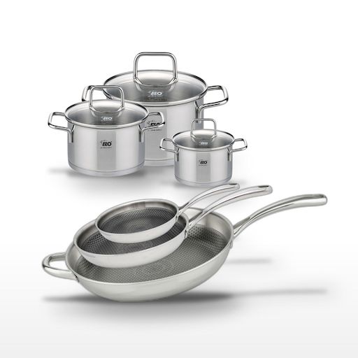 - COMPOSITION : Poêles en acier inoxydable 18/10 avec revêtement antiadhésif, faitouts en inox avec couvercles en verre.