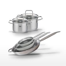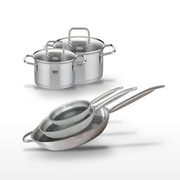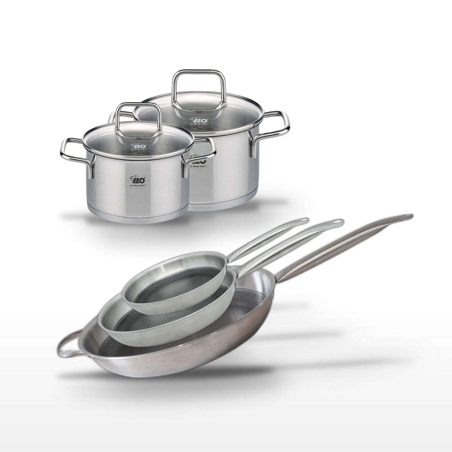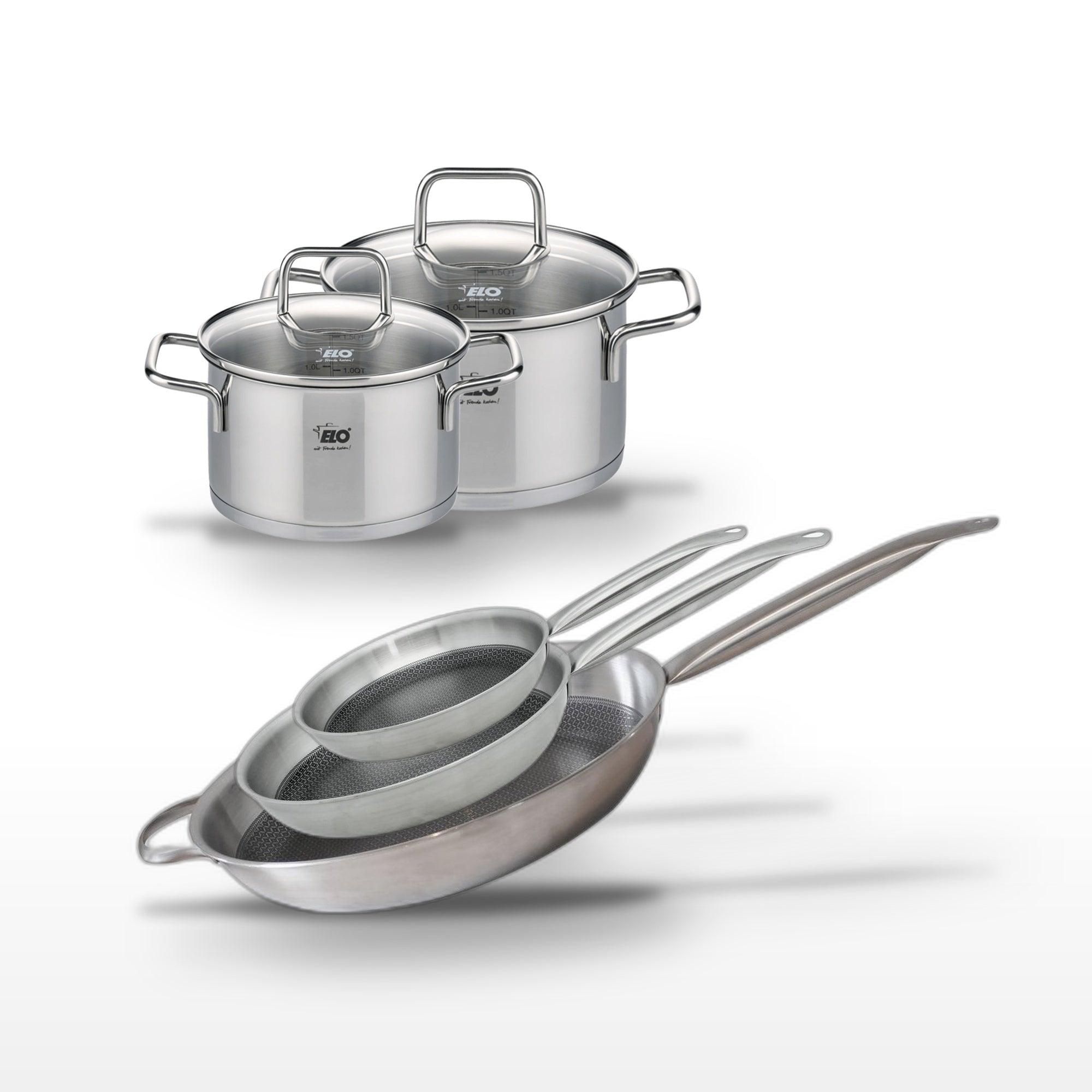- DESCRIPTION : DESCRIPTION : Ensemble de 3 poêles Elo Relief Solution en acier inoxydable avec revêtement antiadhésif ELODUR® Select, et 2 faitouts en inox Elo Citrin.