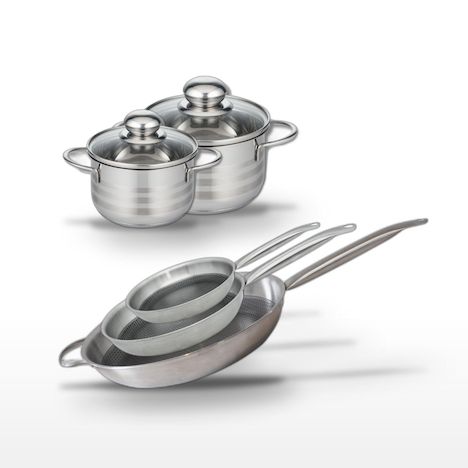 - DESCRIPTION : Le lot Elo Relief Solution comprend des poêles de 24, 28 et 32 cm en acier inoxydable 18/10, et des faitouts de 12 et 14 cm. Idéal pour une cuisson homogène et sans PFAS.