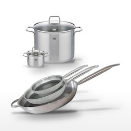 - COMPOSITION : Acier inoxydable 18/10, aluminium, revêtement ELODUR® Select sans PFAS pour les poêles, acier inoxydable et verre pour les faitouts.