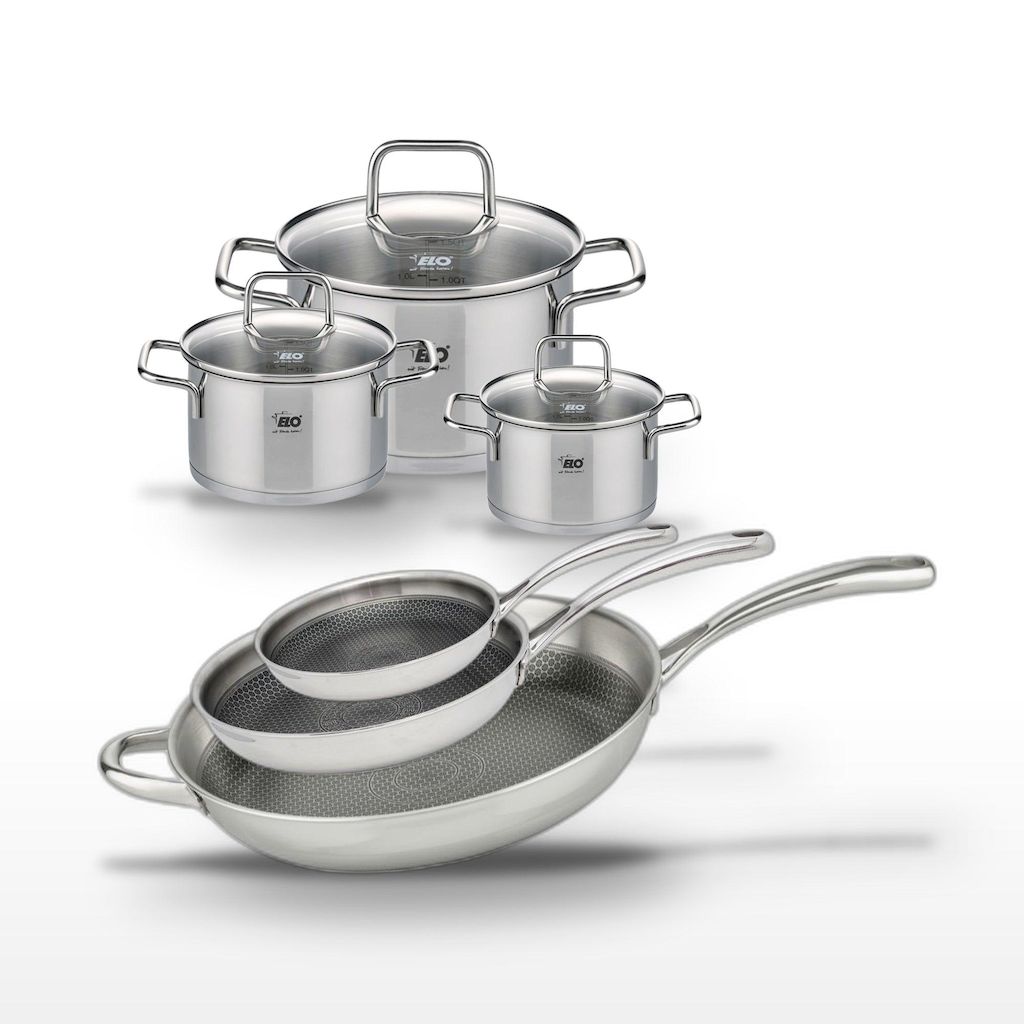 - DESCRIPTION : L'ensemble Elo Relief Evolution offre trois poêles et trois faitouts en acier inoxydable, idéals pour une cuisson saine et homogène.