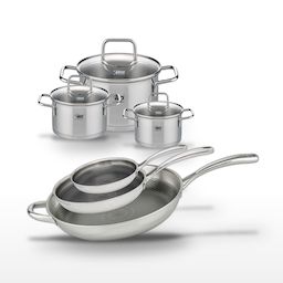- COMPOSITION : Acier inoxydable 18/10 pour les poêles, acier inoxydable et verre pour les faitouts, assurant robustesse et répartition uniforme de la chaleur.