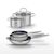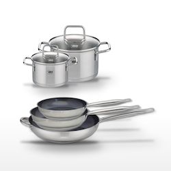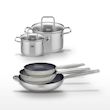 - COMPOSITION : COMPOSITION : Poêles en acier inoxydable 18/10 avec revêtement sans PFAS. Faitouts en inox avec couvercle en verre.