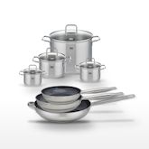 - COMPOSITION : COMPOSITION : Poêles en acier inoxydable 18/10 avec revêtement sans PFAS, faitouts en acier inoxydable et verre, garantissant robustesse et sécurité.