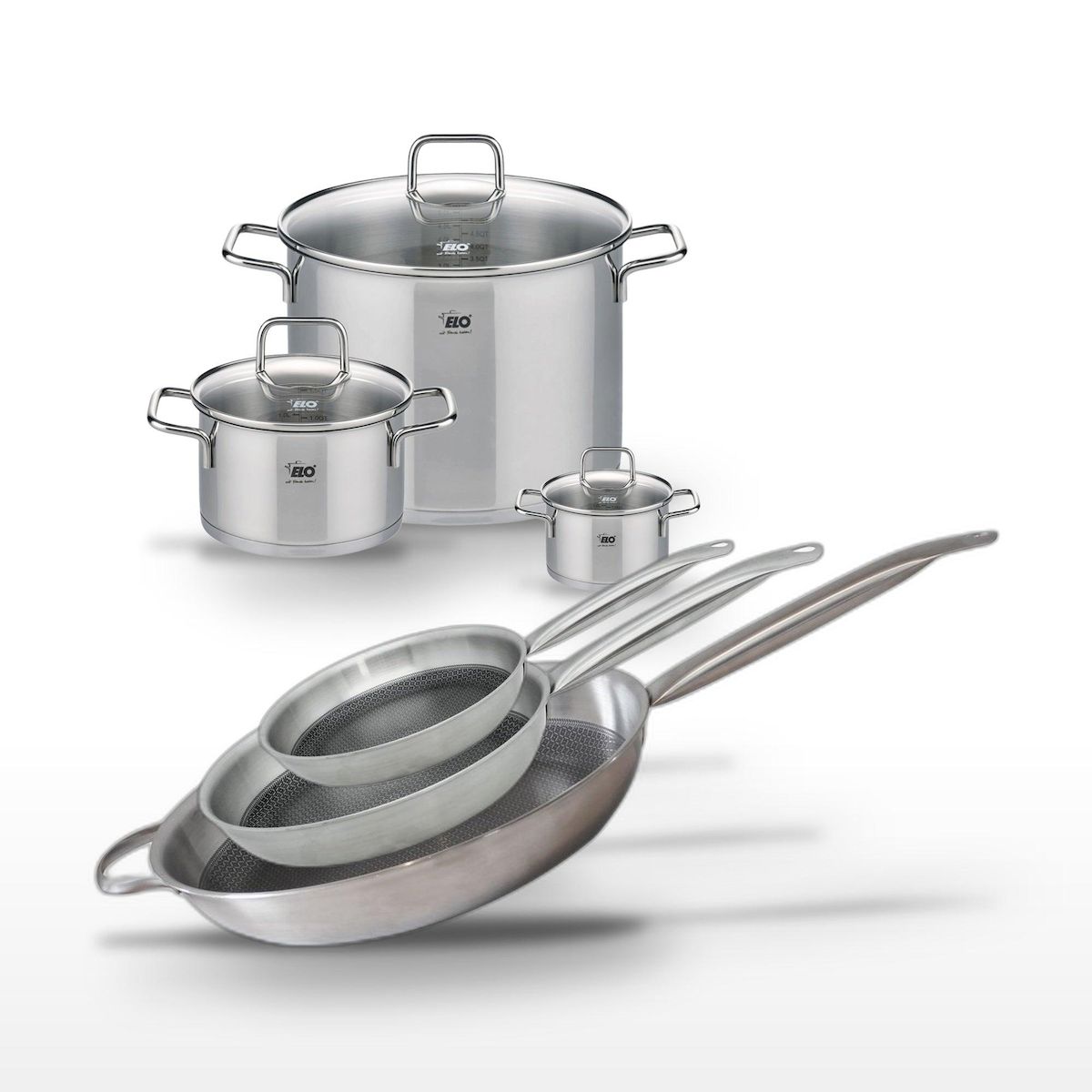 - DESCRIPTION : DESCRIPTION : Ensemble de poêles et faitouts Elo pour une cuisine complète. Les poêles en acier inoxydable 18/10 de la collection Relief Solution garantissent une cuisson homogène et sans adhérence.
