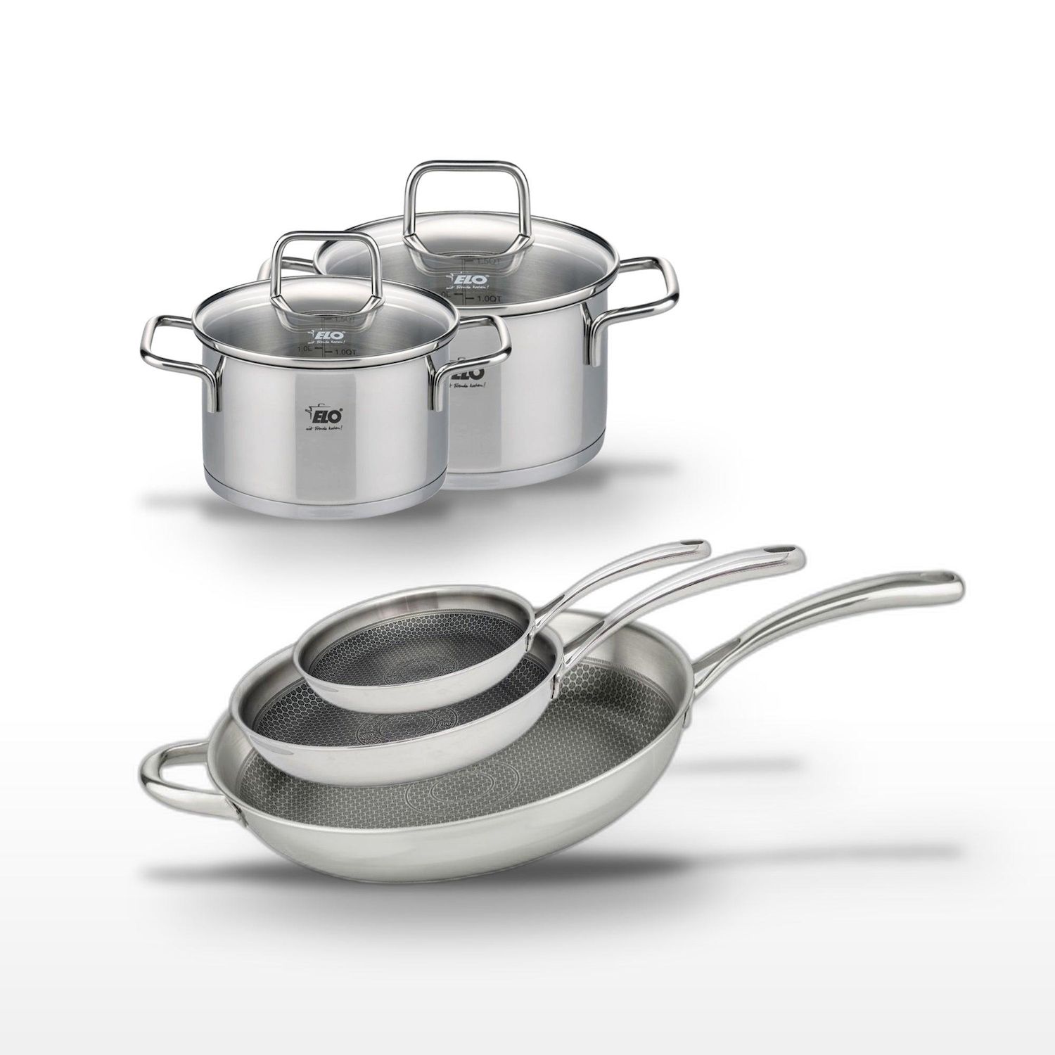 Lot de 3 Poêles 24/28/32cm et 2 Faitouts 14/16cm Elo Relief Evolution