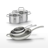 Le lot Elo Relief Evolution est conçu pour répondre aux besoins des professionnels de la cuisine et des amateurs exigeants. Composé de trois poêles de 24 cm, 28 cm, et 32 cm, et de deux faitouts de 14 cm et 16 cm, ce lot offre une polyvalence inégalée pour une variété de préparations culinaires. Chaque poêle est dotée d'une structure Triply, combinant acier inoxydable 18/10, aluminium et acier magnétique, garantissant une distribution homogène de la chaleur. Le revêtement antiadhésif ELODUR® Professional, exempt de PFAS, assure une cuisson saine et empêche les aliments d'adhérer, tout en étant résistant aux rayures. Les faitouts, avec leur fond capsulé, sont parfaits pour préserver les nutriments de vos ingrédients tout en étant économes en énergie. Adaptés à tous les types de feux, y compris induction et four, ces ustensiles sont conçus pour durer et simplifier l'entretien. Ils représentent un choix judicieux pour toute cuisine professionnelle ou domestique, alliant performance, durabilité et design élégant.