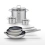 - COMPOSITION : Poêles en acier inoxydable 18/10 avec revêtement sans PFAS, faitouts en inox avec couvercles en verre.